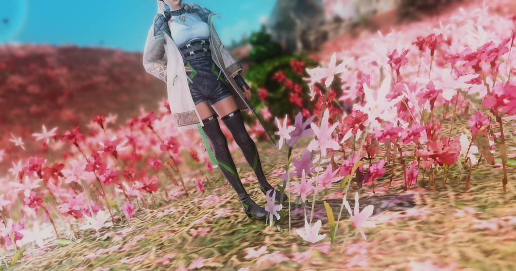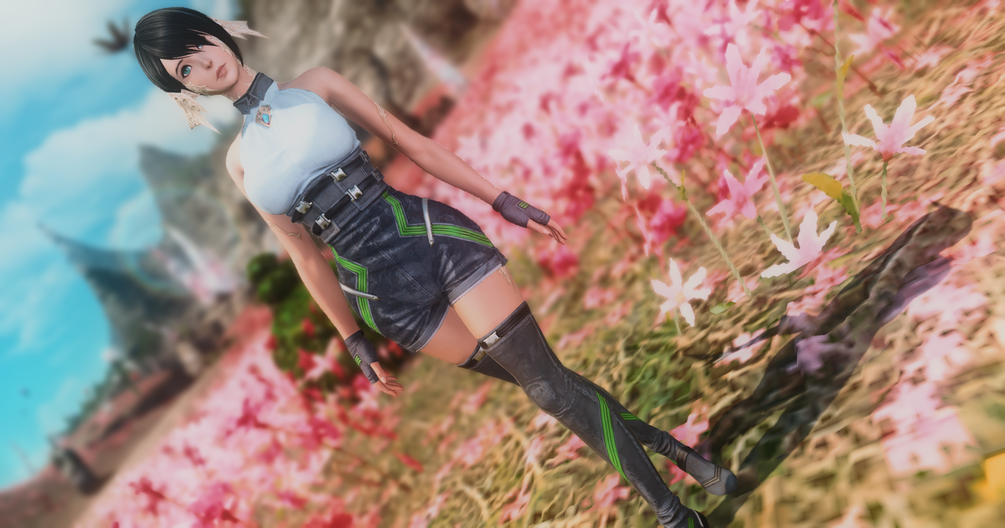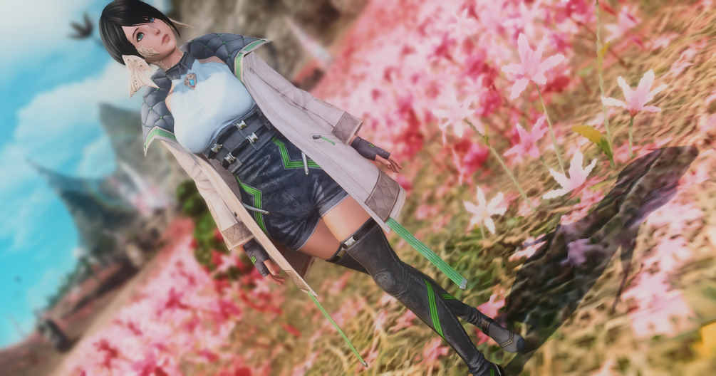 The outfit is composed of a - removable - coat with a very large collar, and a leotard suit, aswell as tight to the skin highboots. It also comes along an optional necklace that is a pink and blue crystal, and with fingerless gloves with a - removable - string bracelet.